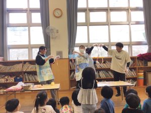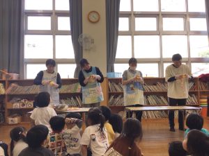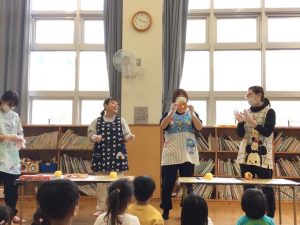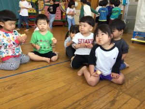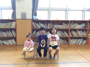 前に出て、名前、何歳になったか、好きな食べ物など発表しました。