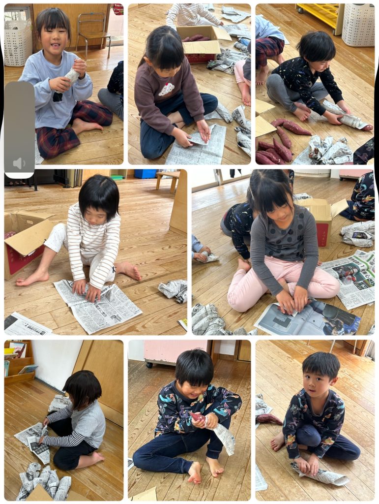 焼き芋大会の日の予報は雨💦延期かな?と悩みながらもみんなで落ち葉🍂を集めにお散歩に出かけたり、ジャンプ組はさつまいもを新聞紙で巻いてくれました😊