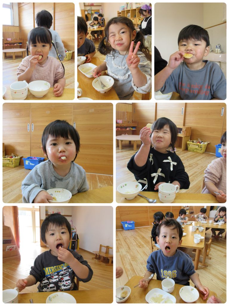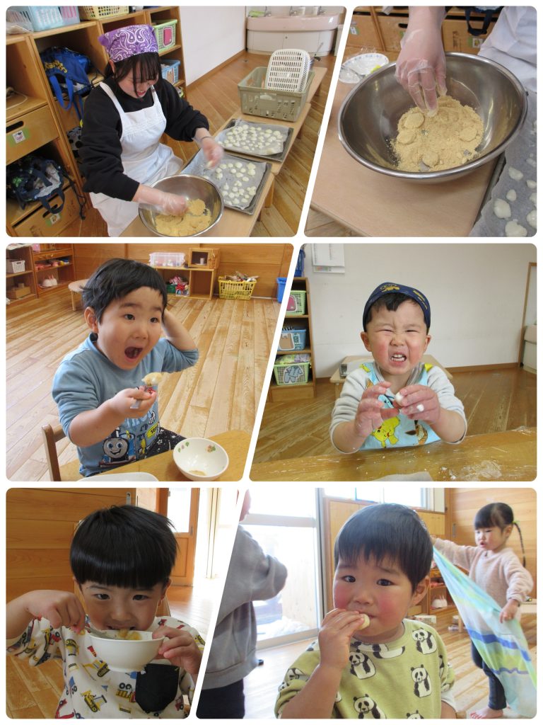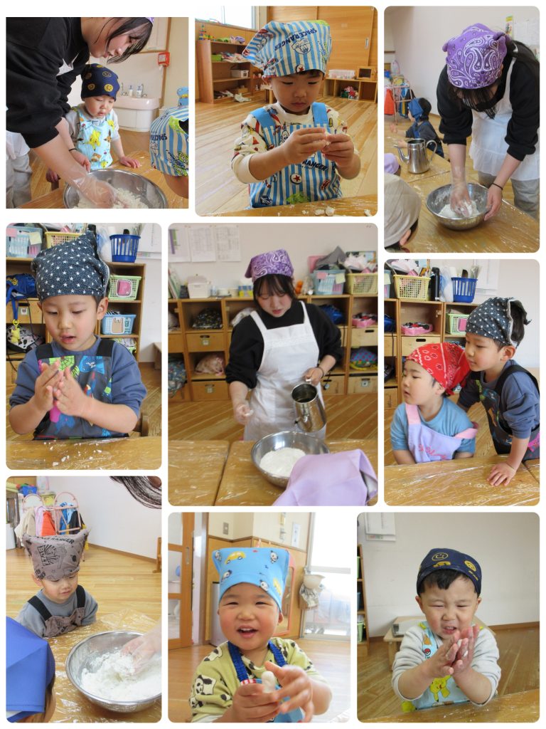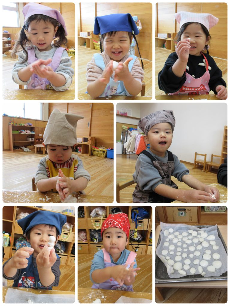 2026年1月9日 / 最終更新日時 : 2026年1月20日 poppoen 給食室 だんご作り🍡 ぴょんぴょん組が、初めてクッキングをしました😊 保育士が粉にぬるま湯を少しずつ入れて、耳たぶの固さになるように混ぜました😄 ぬるま湯を入れていくとだんだんとまとまっていくので「魔法の水」✨と言いながら混ぜたよ! こねた生地は子どもたちが「もーちつき ぺったんこ♪」と歌いながら丸めました👏 丸めた団子は給食室で蒸してもらってからきな粉をつけて食べました😋 たくさんできたので他のクラスにもお裾分けしました。みんな喜んでたべてくれたよ🥰