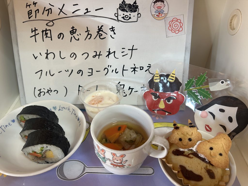 (メニュー)牛肉の恵方巻き、いわしのつみれ汁、フルーツのヨーグルト和え