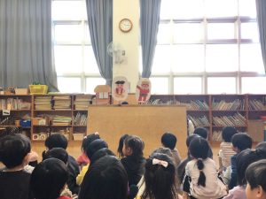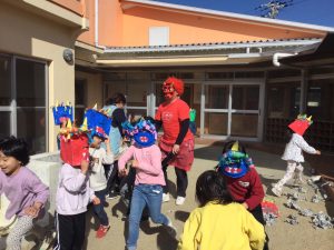 最後には幼児組の子たちが 新聞紙で作った豆を投げて